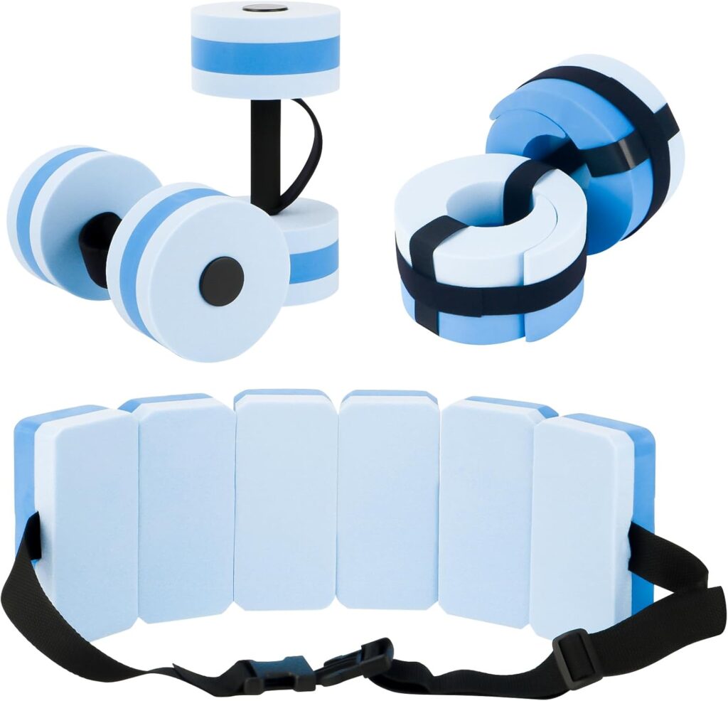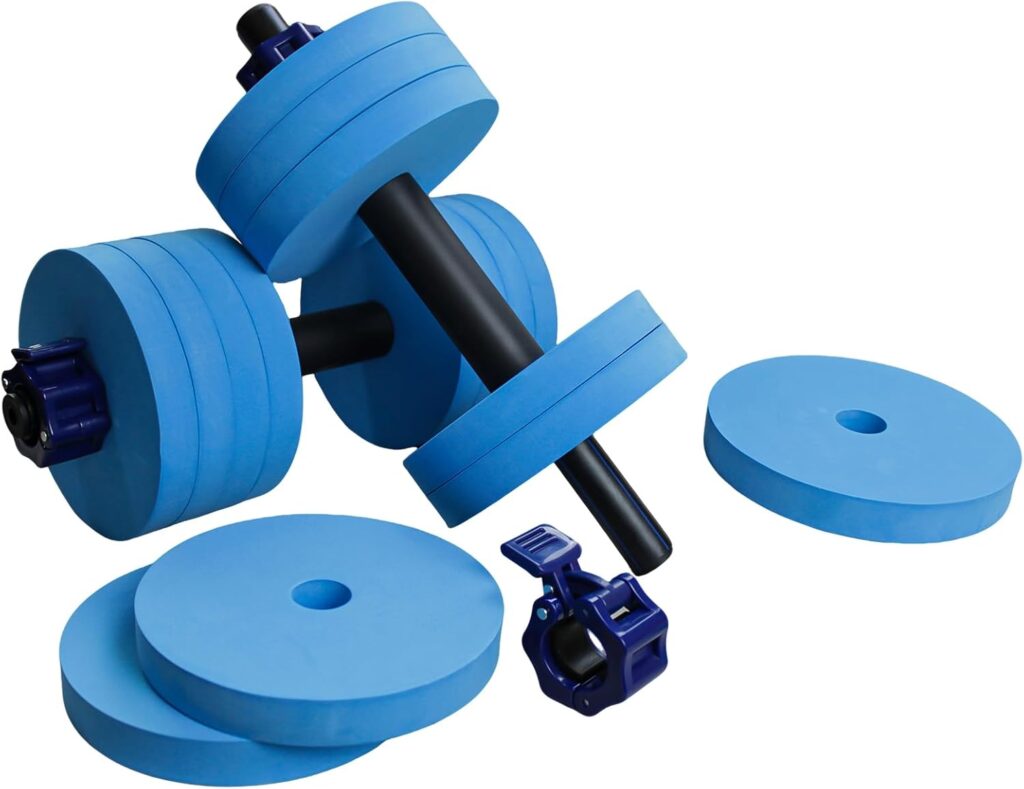 These dumbbells come with 16 EVA foam discs for customizable resistance, allowing gradual strength progression. The modular design appeals to users wanting flexibility in workout intensity. Build quality feels reliable for regular pool sessions.